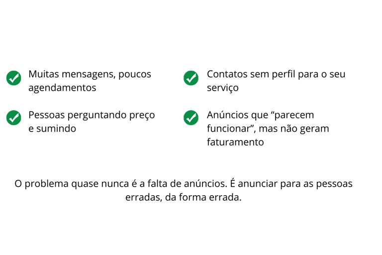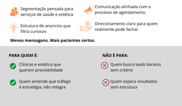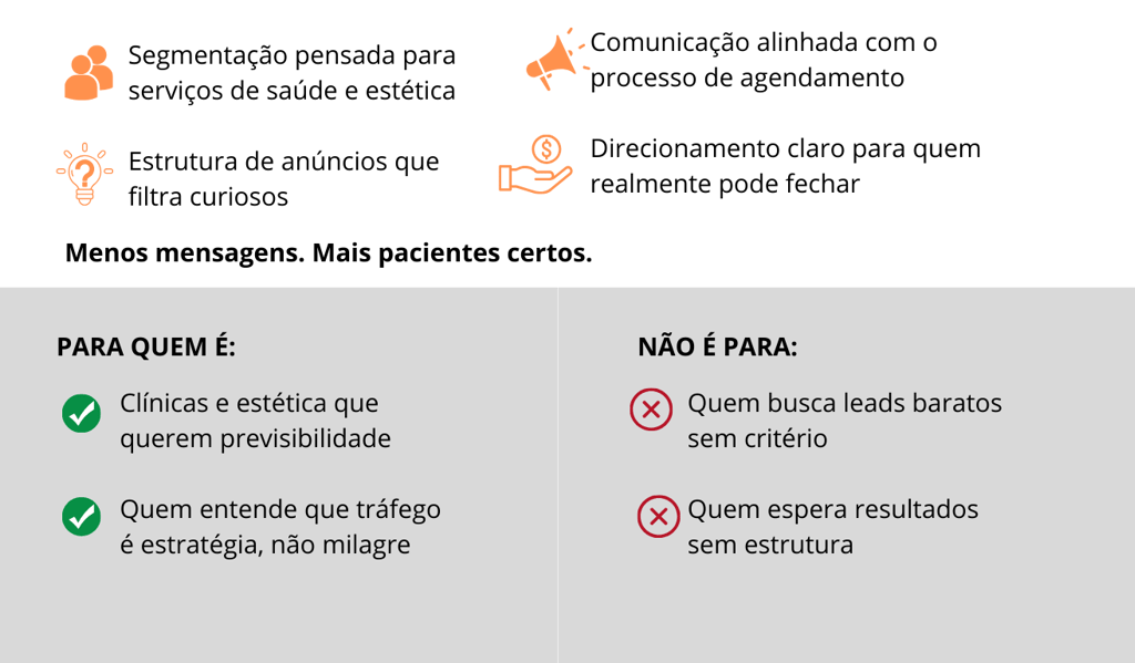 Tráfego pago para clínicas e estética que precisam de leads qualificados, não apenas mais conversas no WhatsApp.